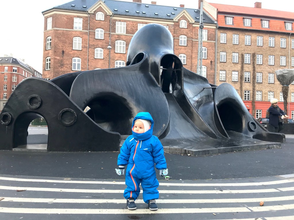 Dönüş günümüz her ne kadar havai fişek seslerinden uyuyamasam da Deniz Tibet’le her zamanki gibi erkenden başladı. Biz de toparlanıp kahvaltımızı yaptıktan sonra evimizin olduğu bölge Norrebro’yu gezmek için dışarı çıktık. Hemen yanımızdaki muralleriyle ünlü Bananna Park’ı dolaşıp bir diğer ünlü hipster parkı Superkilen Park’a yürüdük. Park kaykay alanı, çimenlik alan ve spor aletleri ve salıncakların olduğu kırmızı alan ile üç parçadan oluşuyor. Açıkçası fotoğrafları bende çok daha büyük bir parkmış izlenimi bırakmıştı. 1 Ocak sabahı dışarıda pek insan göremeyeceğimizi düşünüyordum fakat Superkilen’de bizim gibi birkaç bebekli aileyle birlikte partilemeye devam ettik!