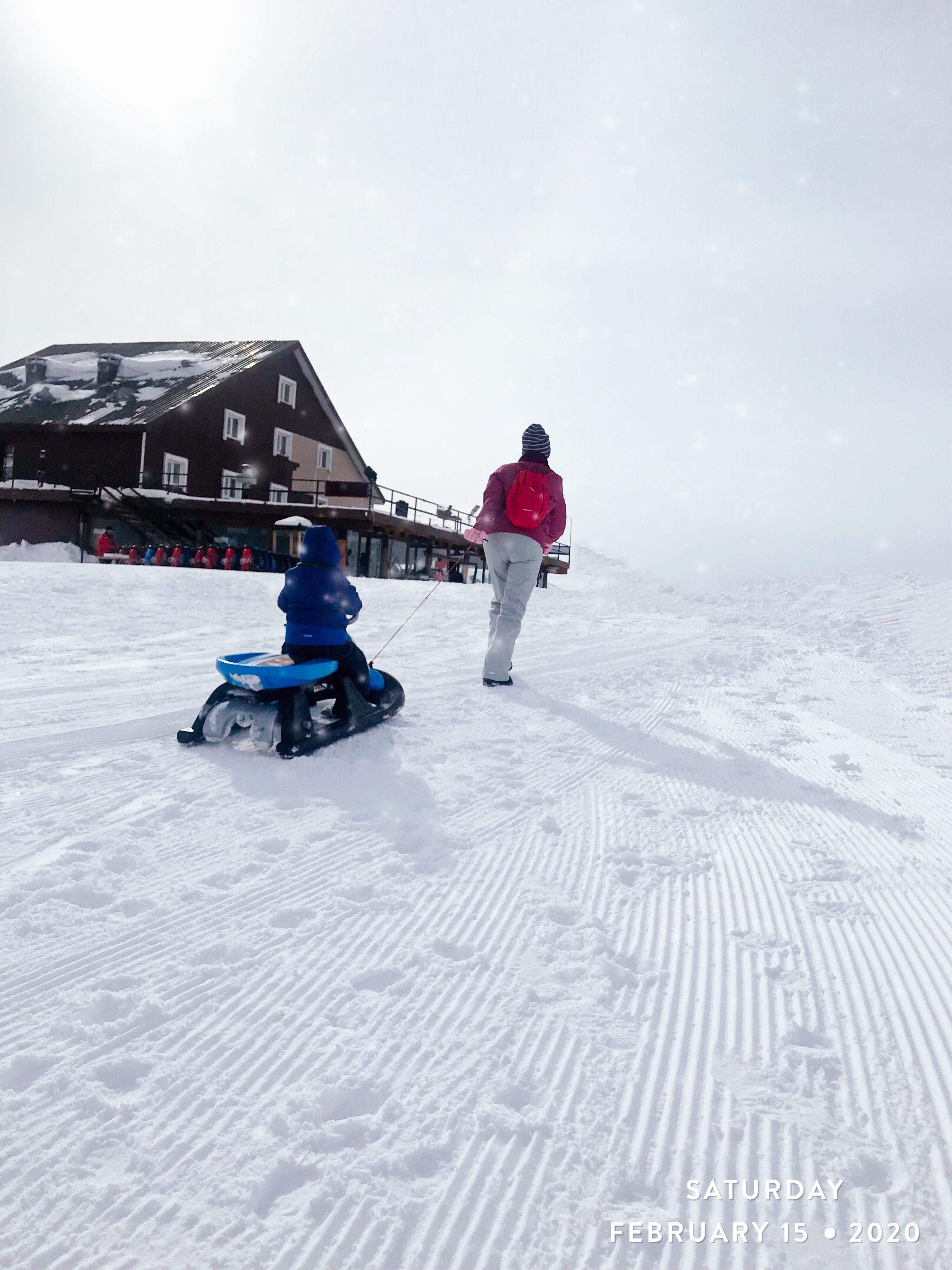 Sabah kahvaltısı 08:00’da başlıyor. Eşim kahvaltıdan sonra hemen kaymaya gitti. Biz saat 10:00’a kadar bekledik. Sonra giyinip çıktık. Hava çıktığımızda -4 dereceydi. Otelin kızaklarından kiraladık. Saati 25₺, günlük 50₺. Biz günlük kiraladık ve otele girerken bırakıp, tekrar çıktığımızda yine aldık.