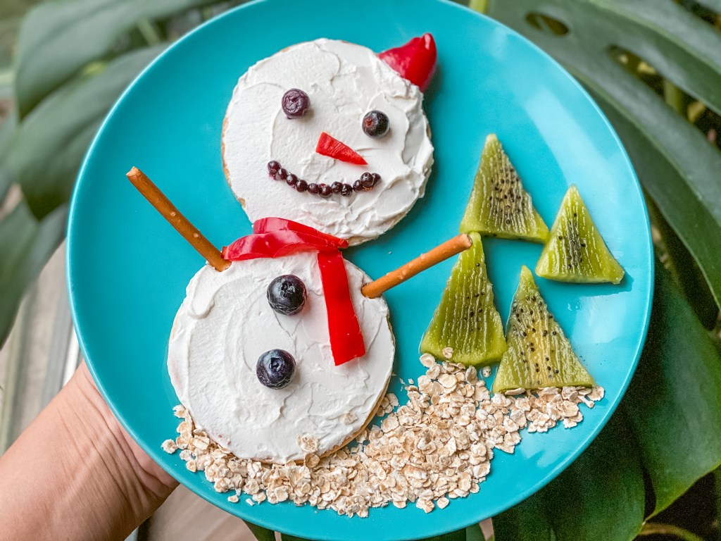 Kardan adam şekilli pankek için iki adet yuvarlak pankeki direkt olarak tabağa koydum ve üzerlerine bolca labne sürerek bir bütün hale getirdim. Bir çubuk krakeri ortadan kırıp alt yuvarlağa sokarak kollarını oluşturdum. Düğmeler için yaban mersini kullandım, Atkısını yaban mersini ile yaptım. Şapkasını kapya biberin ucu ile yaptım, burada çilek de kullanabilirsiniz, bizde o sırada evde yoktu. Burun için yine kapya biberden üçgen kesip koydum ama havuçtan kesmek daha gerçekçi olur, ben o sırada düşünememişim. 🙂 Gözleri için yine yaban mersini kullandım ama en ufaklardan seçerek, eğer elinizde küçük yoksa zeytin kesip konulabilir. Ağzı için böğürtlenin tanelerini ayıkladım. 🙂 Kardan adam tamamlanmış oldu böylece. Alt kısma toprak için yulaf serpiştirdim, çam ağaçları için de kivileri üçgen kesip koydum, neşeli pankek tabağı hazır.